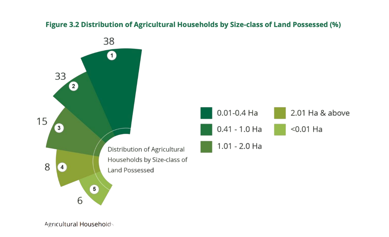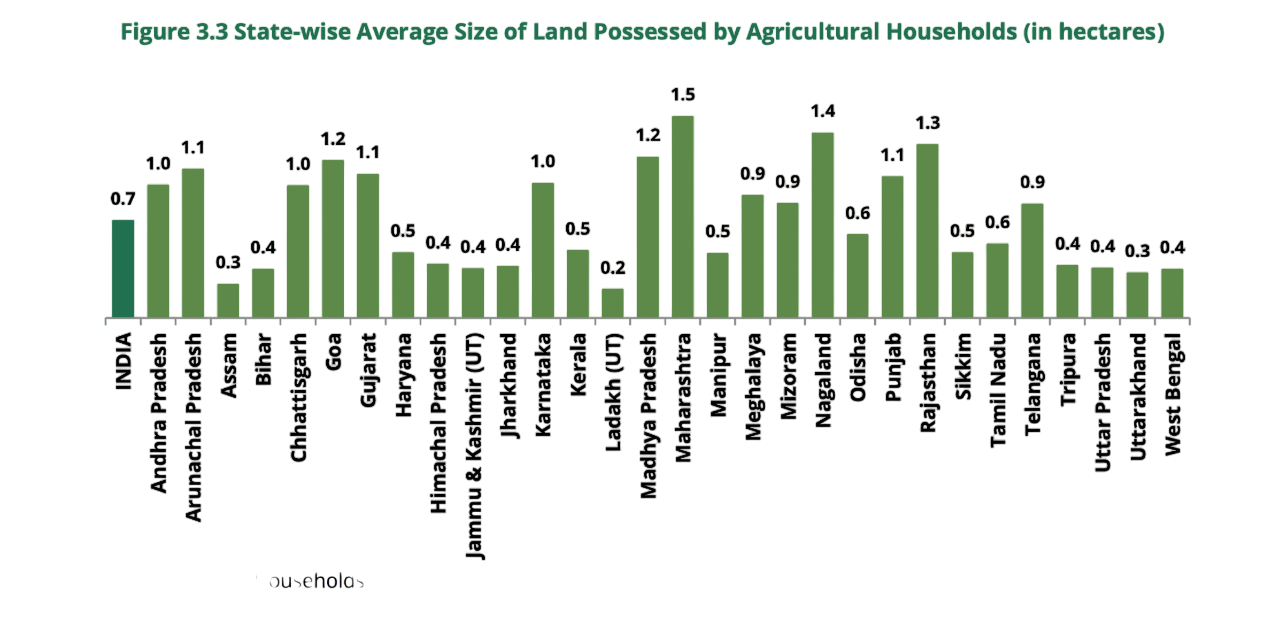 The above graphic sourced from the NABARD All India Rural Financial Inclusion Survey 2.0 (NAFIS) which was conducted in 2021-22 and published in 2024 paints a pretty clear picture. In fact, since the first NAFIS was published in 2016, the average landholding for farmers decreased from 1.08 hectares to 0.74 hectares, a fall of 31% over 5 years.